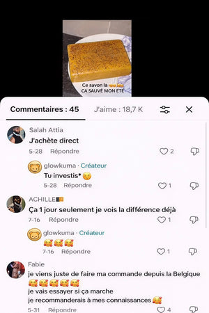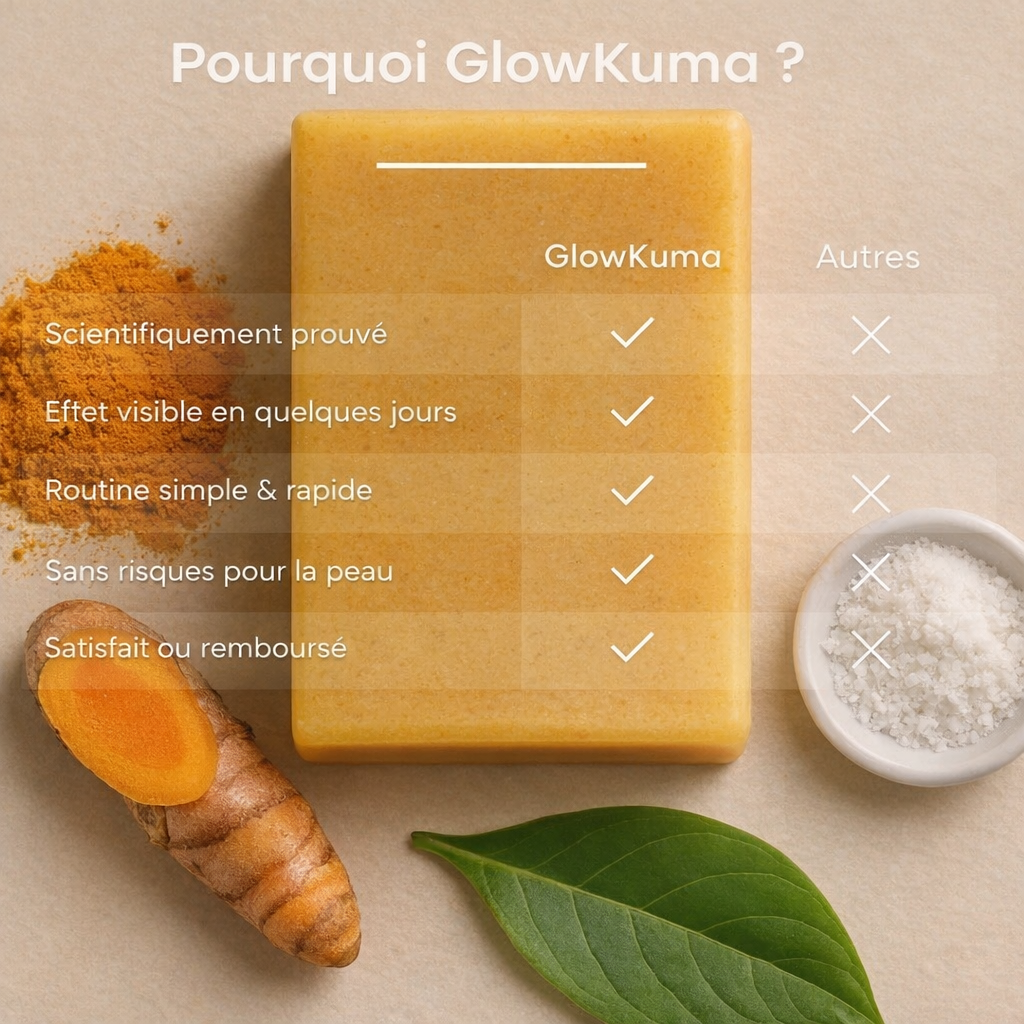 Grâce au savon et aux pads au curcuma GlowKuma, la peau est purifiée et le teint paraît plus uniforme et lumineux. Il aide à révéler une peau plus nette, douce et éclatante